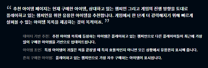 데이터 기반 추천 : 추천 아이템 목록에 등장하는 아이템은 플레이하고 있는 챔피언으로 다른 플레이어들이 최근에 가장 만힝 구매한 아이템을 기반으로 업데이트됩니다! 마치 블리츠 앱의 시스템을 그대로 가져온 것 같네요!