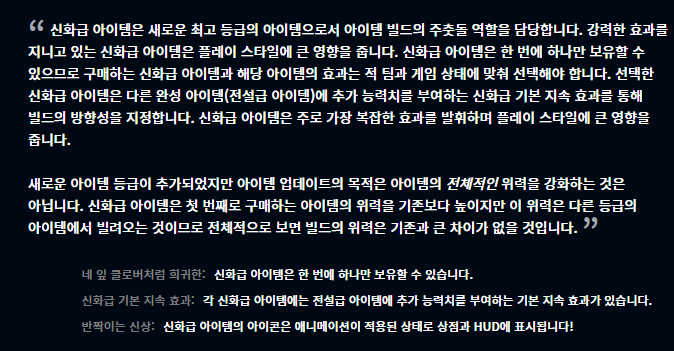 말하자면 아이템 등급이 나뉘게 된 것입니다! 새로운 아이템 등급이 추가되었지만 아이템 업데이트의 목적은 아이템의 전체적인 위력을 강화하는 것은 아니라고 합니다. 신화급 아이템은 첫 번째로 구매하는 아이템의 위력을 기존보다 높이지만 이 위력은 다른 등급의 아이템에서 빌려오는 것이므로 전체적으로 보면 빌드의 위력은 기존과 큰 차이가 없을 것입니다.