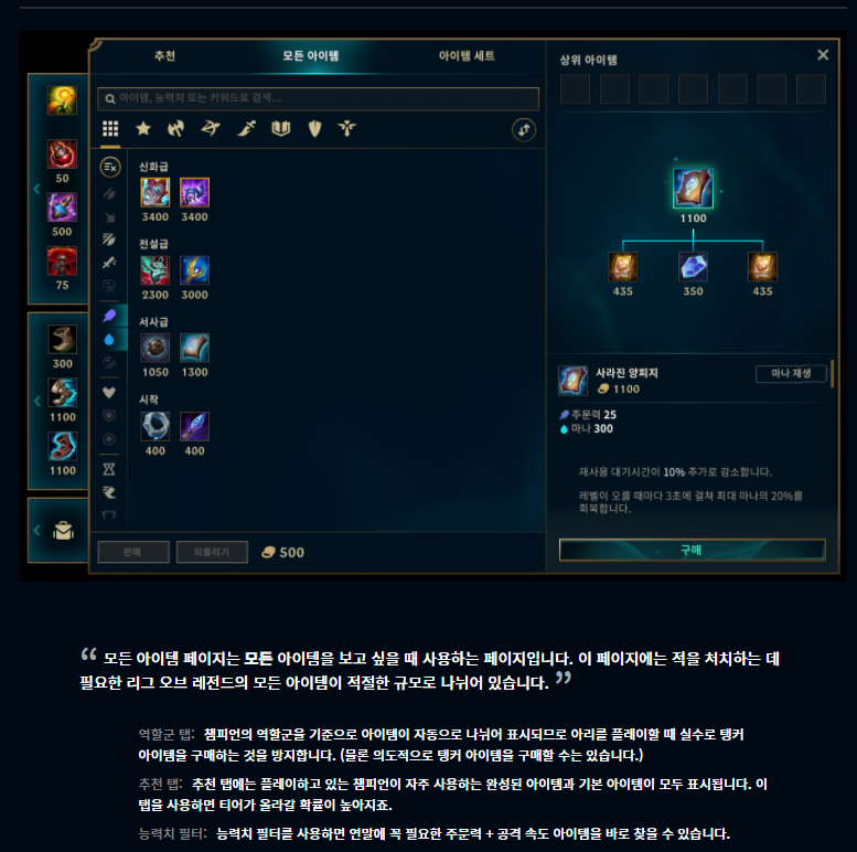 모든 아이템 페이지는 모든 아이템을 보고 싶을 때 상요하는 페이지입니다. 이 페이지에는 적을 처치하는 데 필요한 리그오브레전드의 모든 아이템이 적절한 규모로 나뉘어 있습니다.