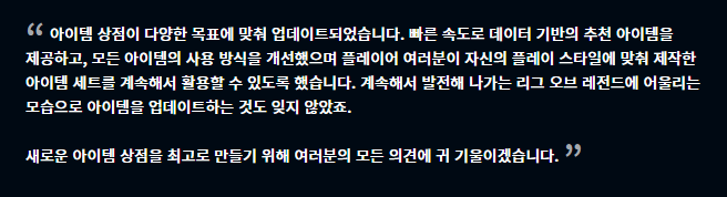 정리하자면, 이상 세 가지 기능은 리그오브레전드의 뉴비 유저이든, 고인물 유저이든 모두에게 유익한 데이터를 제공하게 될 것으로 보입니다. 저도 처음 리그오브레전드를 할 때 너무 많은 템트리와 이해되지 않는 장황한 아이템 설명때문에 많이 혼란스러웠거든요. 앞으로도 고인물만 하는 망겜이 되지 말고 신규 유저들이 많이 생겨났으면 좋겠습니다!