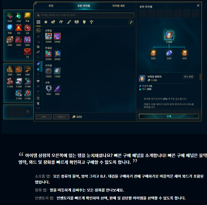 아이템 상점의 오른쪽에는 빠른 구매 패널이 생겼습니다. 빠른 구매 패널은 물약, 영약, 와드 및 장화를 빠르게 확인하고 구매할 수 있도록 합니다!